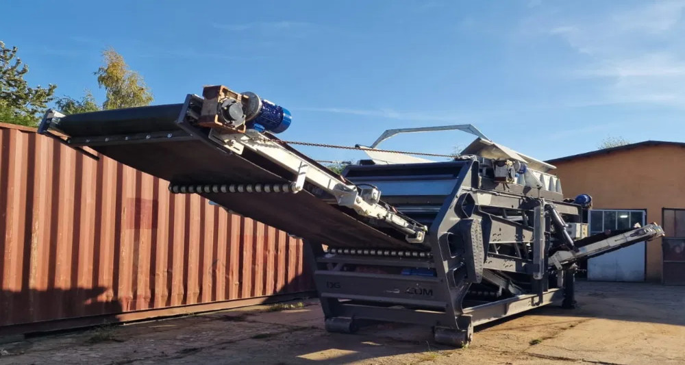 Przesiewacz trzech frakcji z trzema taśmami transportowymi. Sieje kompost, torf, czarnoziem, żwir, zrębki, korę, kruszywo kolejowe oraz inne materiały ciężkie do siania.